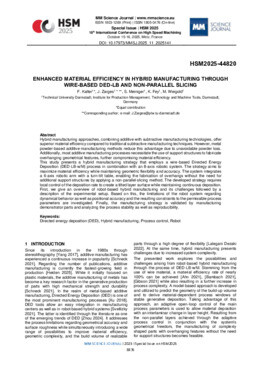 Hybrid manufacturing approaches, combining additive with subtractive manufacturing technologies, offer superior material efficiency compared to traditional subtractive manufacturing techniques. However, metal powder-based additive manufacturing methods reduce this advantage due to unavoidable powder loss. Additionally, most additive manufacturing processes necessitate the use of support structures to fabricate overhanging geometrical features, further compromising material efficiency. This study presents a hybrid manufacturing strategy that employs a wire-based Directed Energy Deposition (DED-LB-w/M) process in combination with an 8-axis robotic system. The strategy aims to maximize material efficiency while maintaining geometric flexibility and accuracy. The system integrates a 6-axis robotic arm with a turn-tilt table, enabling the fabrication of overhangs without the need for additional support structures by applying a non-parallel slicing method. The developed strategy requires local control of the deposition rate to create a tilted layer surface while maintaining continuous deposition. First, we give an overview of robot-based hybrid manufacturing and its challenges followed by a description of the experimental setup. Based on this, the limitations of the robot system regarding dynamical behavior as well as positional accuracy and the resulting constraints to the permissible process parameters are investigated. Finally, the manufacturing strategy is validated by manufacturing demonstrator parts and analyzing the process stability as well as reproducibility.