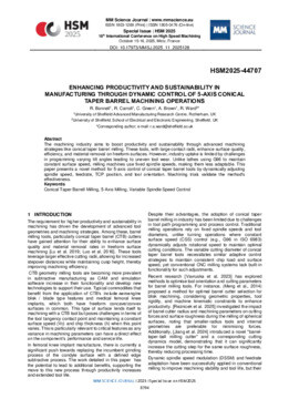 The machining industry aims to boost productivity and sustainability through advanced machining strategies like conical taper barrel milling. These tools, with large contact radii, enhance surface quality, efficiency, and material removal on freeform surfaces. However, industry uptake is limited by challenges in programming varying tilt angles leading to uneven tool wear. Unlike lathes using G96 to maintain constant surface speed, milling machines use fixed spindle speeds, making them less adaptable. This paper presents a novel method for 5-axis control of conical taper barrel tools by dynamically adjusting spindle speed, feedrate, TCP position, and tool orientation. Machining trials validate the method’s effectiveness.