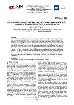 Titanium alloys are widely employed in several industrial applications, including medical sector thanks to their biocompatibility, and are useful when high strength-to-weight ratio, high temperature and corrosion resistance are desirable. Since titanium alloys have considerably low thermal conductivity and high hardness, thus being difficult to machine, abrasive water-jet machining (AWJM) represents an interesting technology to preserve the material’s properties, as it also reduces the damage caused by material overheating. In order to obtain micro details for precision engineering, micromilling with micro-ball end mills can be used as a secondary process to refine the surface previously obtained. However, the existing literature lacks in-depth studies on the micromilling process applied to previously AWJ-machined pockets. The aim of this study is to analyze the surface quality of the channels after these two machining processes comparing the results obtained with workpieces without AWJ-machined pockets. To assess the quality of the specimens, surface roughness, burrs formation and dimensional accuracy are investigated. Furthermore, this research aims to offer practical recommendations to optimize the sequential use of hybrid advanced machining strategies for titanium alloys to highlight their potential in high-precision applications.